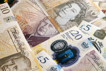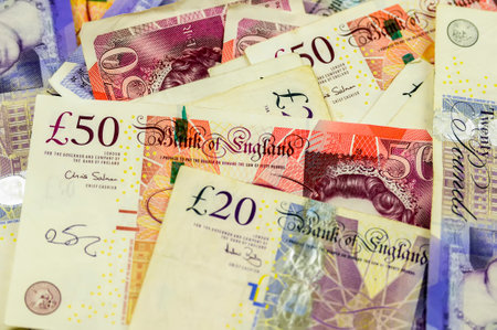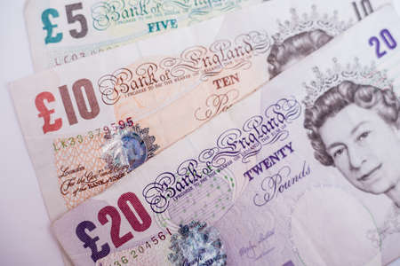 Britain paper money, pound sterling, cash banknotes for financial and business transactions. Britain money as a background for your design