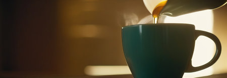 A stunning close-up of rich coffee pouring into a teal cup, set against a soft background. Perfect for cafe themes, relaxation, and lifestyle imagery.