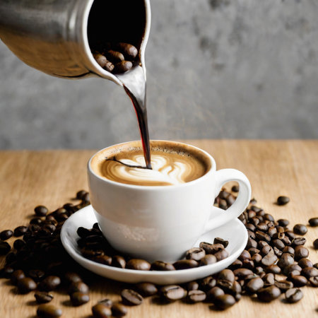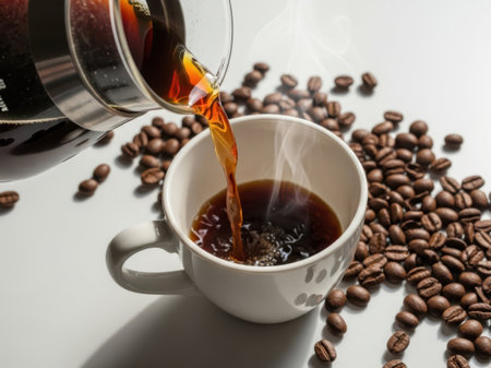 Aromatic coffee poured into a white cup, creating a stunning contrast for a perfect morning drink