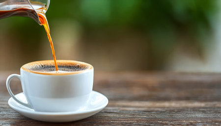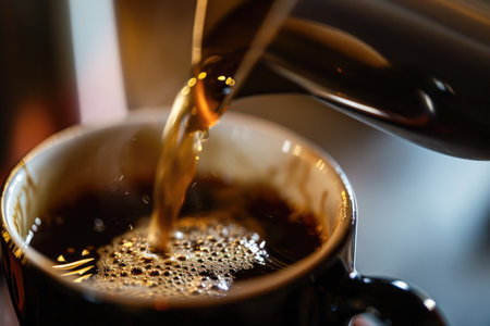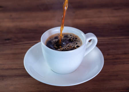 Fresh hot black coffee being poured into white ceramic cup creating foam and warm inviting mood