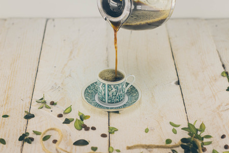 Pouring coffee into a cup, close-up, selective focus