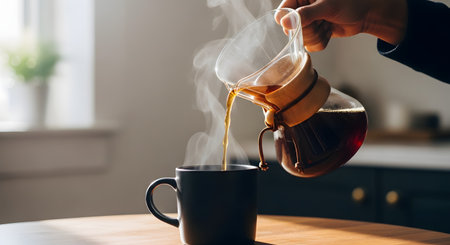 A hand pours steaming hot coffee from a glass pour-over dripper (like a Chemex) into a black mug on a wooden table. The steam rises, creating a cozy and inviting morning atmosphere.