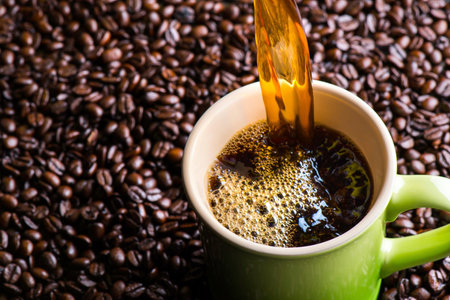 Coffee pouring into a green cup on coffee beans background.
