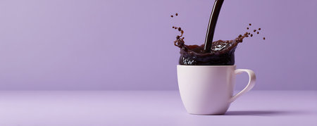 Coffee in a white cup with splashes on a purple background