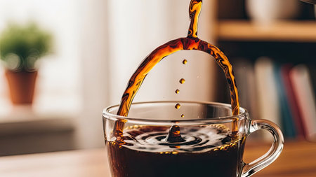 A close-up captures coffee being poured into a clear glass cup. The dark liquid arcs through the air, creating dynamic splash patterns. The lighting highlights the coffee's rich color. Ideal for projects needing visual elements related to beverages, mornings, or refreshment themes.