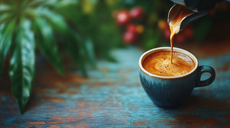The rich aroma of freshly brewed coffee fills the air as a machine dispenses warm liquid into a blue cup. Lush greenery sets a vibrant backdrop, enhancing the coffee experience.