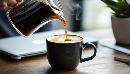 Pouring coffee into a white ceramic mug, AI generated image