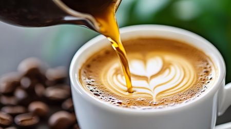 Closeup of Fresh Espresso Being Poured into a White Cup with Latte Art for a Morning Boost