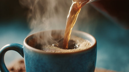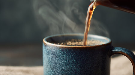 Hot coffee being poured into a mug, steam rising gently from the dark liquid, early morning vibe