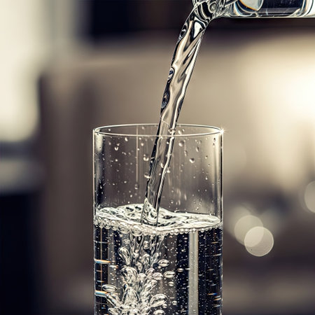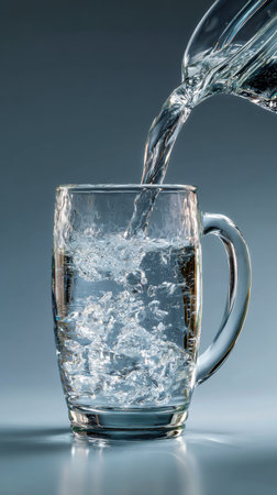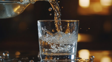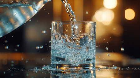 Detailed view of a glass of water being poured from a jug, with splashes and reflections
