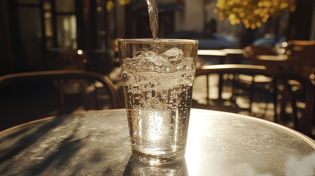 A refreshing scene of cold mineral water being poured into a glass filled with ice, capturing sparkling bubbles in the sunlight on an outdoor table.