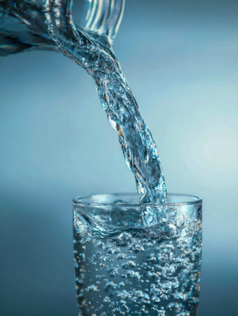 Refreshing hydration scene showcasing pure water cascading from a sleek bottle into a glass brimming with lively bubbles, set against a soothing blue backdrop.