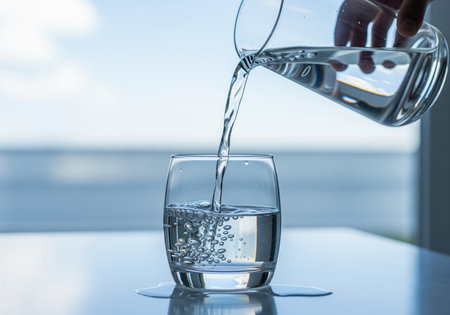 A close up shot captures pristine filtered water gently flowing from a clear glass carafe into a short tumbler, symbolizing purity and refreshment.