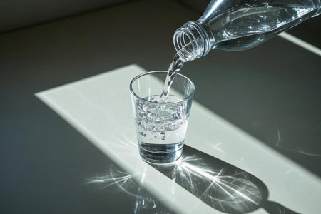 Fresh water pouring from a glass bottle into a drinking glass on a wooden table, emphasizing refreshment and purity