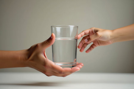 One hand passes a glass of clear water to another person. The scene appears symbolic, emphasizing the sharing of essential resources, as well as trust and care between people.