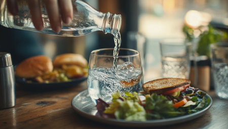 Water being poured into a glass on a table with a salad and sandwich, in close-up. Water pouring from a bottle onto fresh water in a restaurant or home dining room during mealtime. Close-up of hands pouring clean, clear, sparkling water onto a plate. Achieve a healthy lifestyle concept. High-resolution photography. --ar 53:30 --v 6.1 Job ID: c7c861b0-35ba-438f-aed9-fe5dd83de492