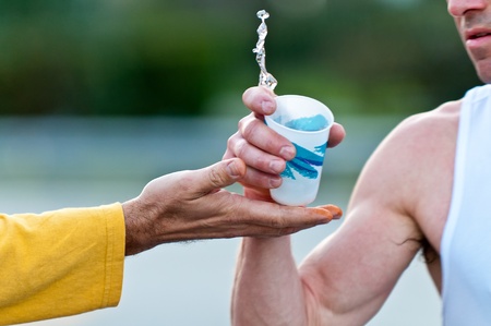 Runner grabbing water during a marathon from a volunteer hand. Use of selective focus.