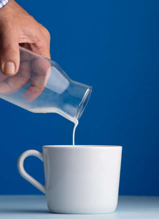 Mans pouring custard cream Into fruit cake with cup of coffee on table.