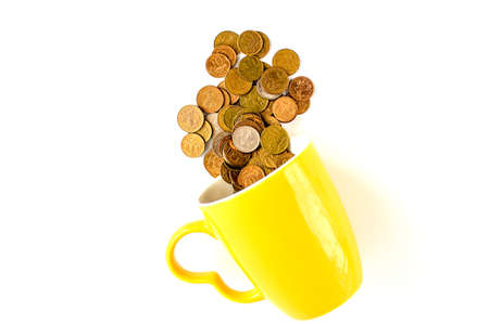 Metallic money poured out of a cup isolated on a white background. Russian pennies. Copy space for text. Selective focus.