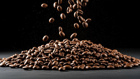 A pile of coffee beans with beans falling onto it, against a dark background.
