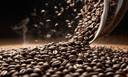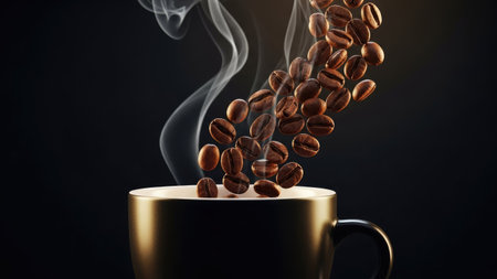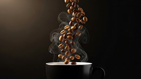 A close-up captures coffee beans cascading into a black mug, with wisps of steam rising. The composition features a dark background, highlighting the roasted beans and the warm tones of the coffee. This image is suitable for various commercial uses related to beverages or food.