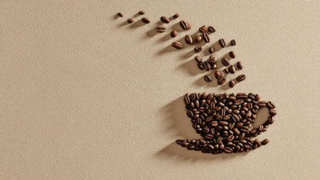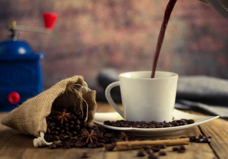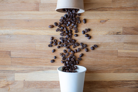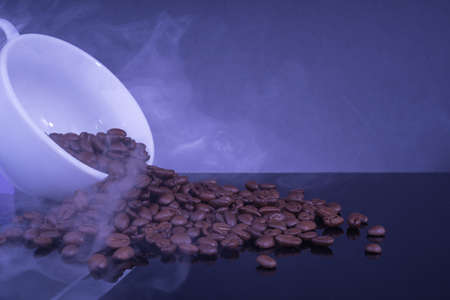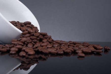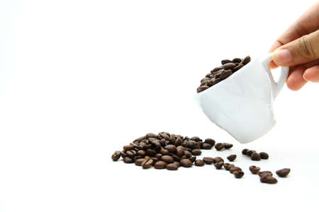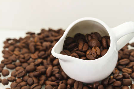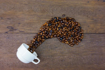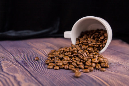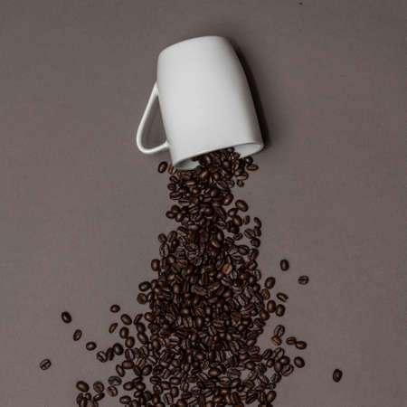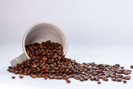 A group of roasted coffee beans, poured from a white cup, ready to be grinded and made a drink, the theme of freshness and relax