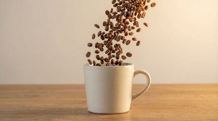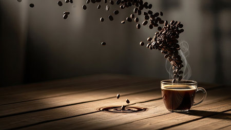 Coffee beans are suspended mid-air, appearing to pour into a glass cup. Steam rises gently, suggesting freshness. The scene takes place on a wooden surface with a shallow depth of field, under soft, directional lighting that enhances textures. Suitable for illustrating themes of beverages and morning rituals.