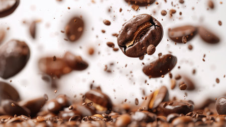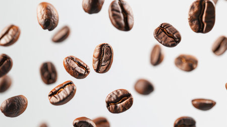 Roasted coffee beans are levitating on a white background, creating a dynamic and energetic scene that embodies the essence of a rich and invigorating coffee experience
