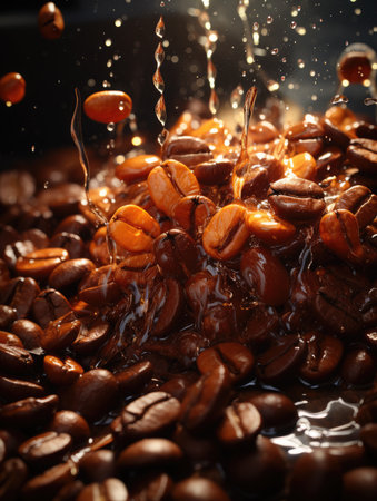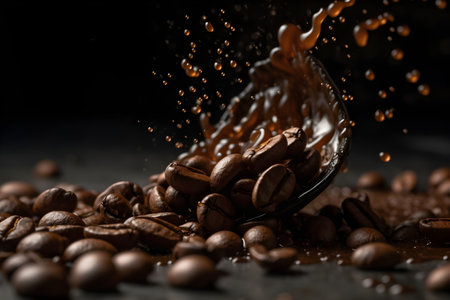 A captivating image of dark coffee splashing in a circular motion, surrounded by whole coffee beans, capturing the richness and aroma of a perfect brew.