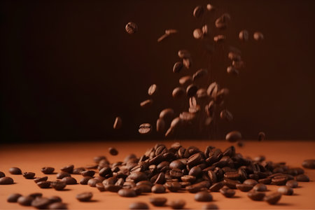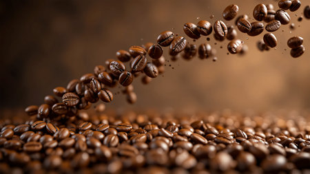 A dynamic shot captures roasted coffee beans in mid-air, falling from a diagonal line onto a plentiful pile of beans below. The warm, blurred background enhances the focus.