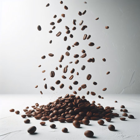 Brown coffee beans are in focus, creating a striking mound on a pristine white background. Several beans dramatically fall from above, enhancing the sense of freshness.