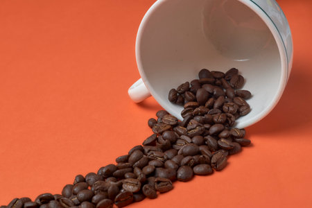 Roasted coffee beans pouring out of a coffee cup with an orange background