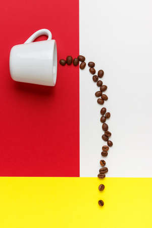 Coffee beans spilling from a white cup on white, red and yellow background.