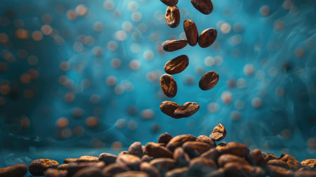 cocoa beans in freeze flying in air against blue petrol background, used to make cocoa and chocolate, with copy space