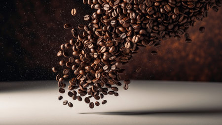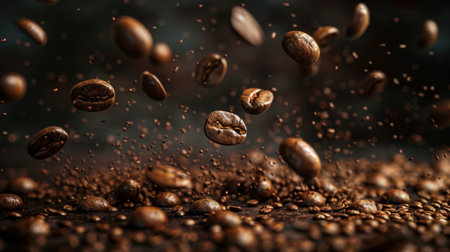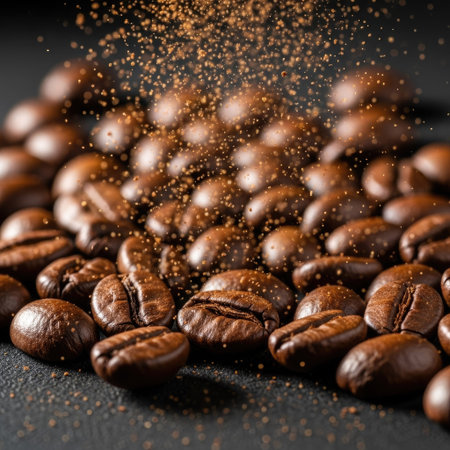 This close-up image showcases a pile of roasted coffee beans with finely ground coffee powder gently cascading from above. The beans, in varying shades of brown, rest on a dark surface, creating a contrast. The lighting highlights their textures, suggesting a fresh, aromatic setting suitable for culinary or beverage-related projects.