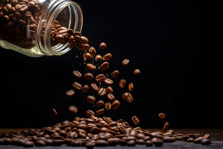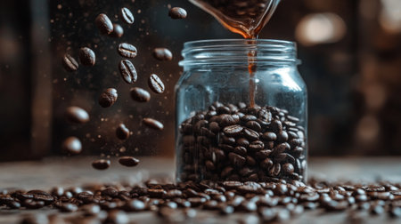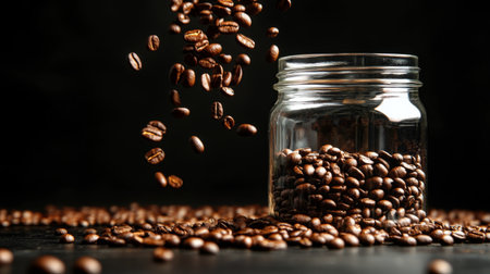 A captivating image of coffee beans falling into a glass jar, showcasing the texture and richness of the beans. Perfect for coffee lovers and culinary themes.