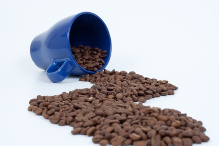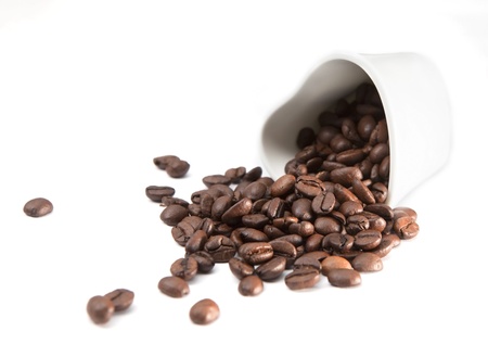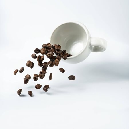 isolated from the white background, a cup of coffee suspended in the air from which a cascade of roasted coffee beans flows