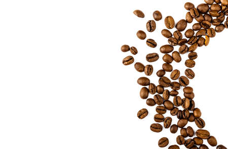 Circle frame of roasted brown coffee beans isolated on white. Background with space for text top view. Detail of circle.
