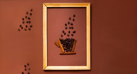 Cup of coffee beansand on dark terracotta background and picture frame mock up. Creative space for design. Trendy minimalism. Close-up