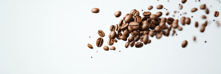 Roasted coffee beans are levitating and falling, creating a small pile on a clean white background, perfect for representing the aroma and energy of a fresh cup of coffee