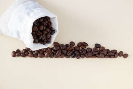 View from the top of a cotton bag full of coffee, against the background of beige, are scattered linearly many toasted grains, there is free space for text to the right of the image and below.