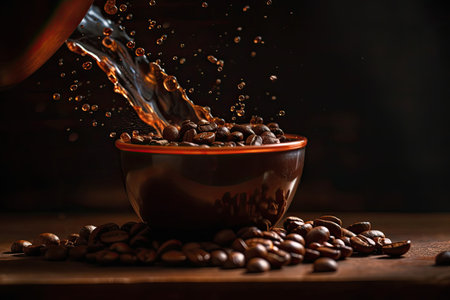 An energetic scene of roasted coffee beans dramatically splashing out of a rustic bowl, set against a textured dark surface for a bold aesthetic.