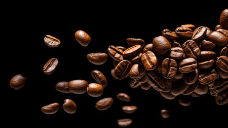 Roasted coffee beans flying on black background. Coffee beans levitate on dark background.