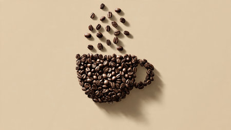 A coffee bean is dropped into a cup that is surrounded by newly roasted coffee beans. Generative AI