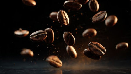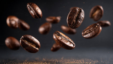 Close-up shot of roasted coffee beans in mid-air against a dark background, emphasizing freshness, aroma, and dynamic energy of coffee.