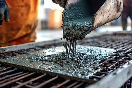 A worker skillfully pours concrete onto reinforcing mesh, showcasing precision and focus in this vital construction task, surrounded by a clean, bright background.