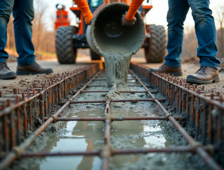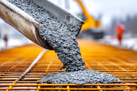 A dynamic scene of concrete pouring from a mixer onto steel rebar framework at a construction site, showcasing the essential processes of building development.