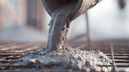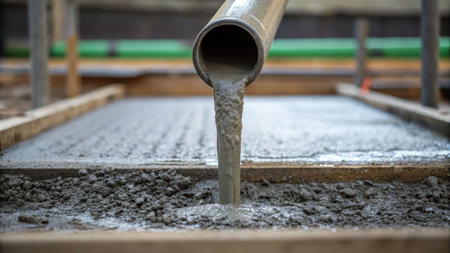 A close-up shot of concrete being poured, showcasing the texture and flow of the material in an industrial setting. Perfect for construction or manufacturing themes.