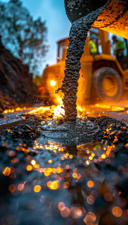 As the day fades into evening, laborers skillfully layer freshly mixed concrete, casting a golden glow over the bustling site and highlighting their diligent efforts.