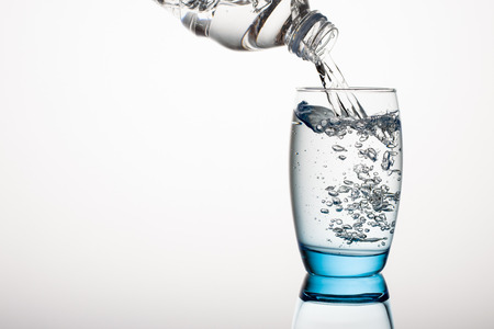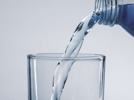 pouring transparent water from a bottle into a glass, closeup, blue background